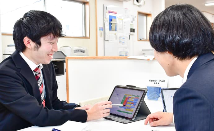 | 出社したらタブレットで出勤時間を申告し、朝礼まで他の社員と仕事の段取りの話などをします。 | |