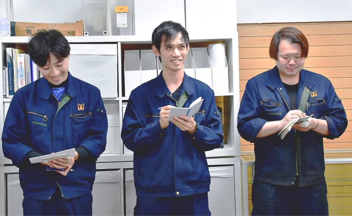 | 全社員で行う朝礼が終わったら、所属している部門の職場で5分間ミーティングを行います。 その日行う予定を確認したり、各自の仕事の進み具合を確認して、その日何を行うのかを決めていきます。 |