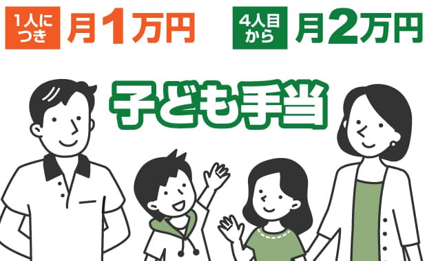 お子様が18歳になるまで1人目から3人目までは1人につき月1万円ずつ、4人目には月2万円を支給します。